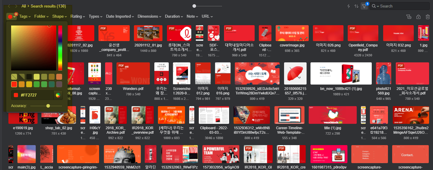 색상, 폴더, 모양, 평점, 확장자 등 다양한 필터 기능