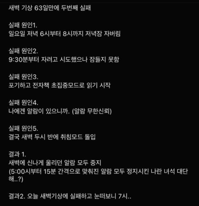 - 새벽 기상에 실패했다고 그날의 루틴을 포기하지 말고 실천.