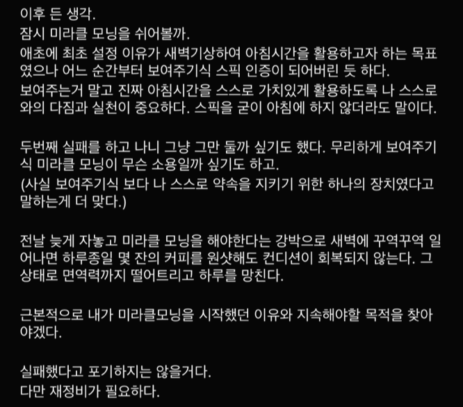- 미라클 모닝: 실패해도 다시 시도하기.