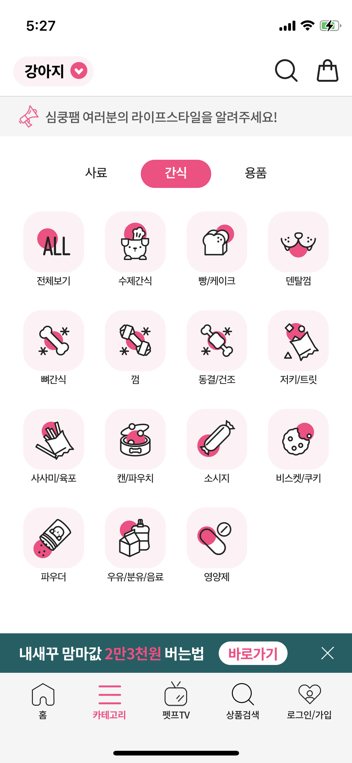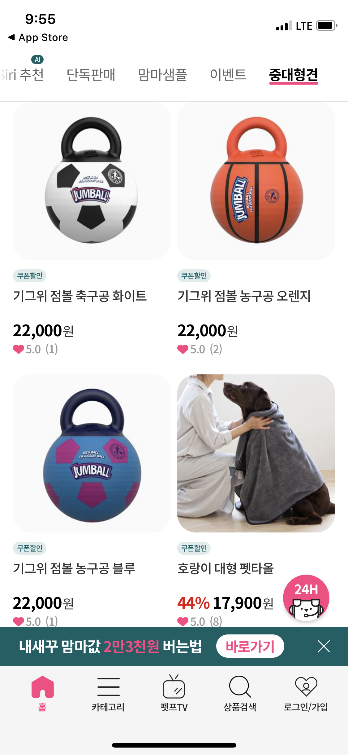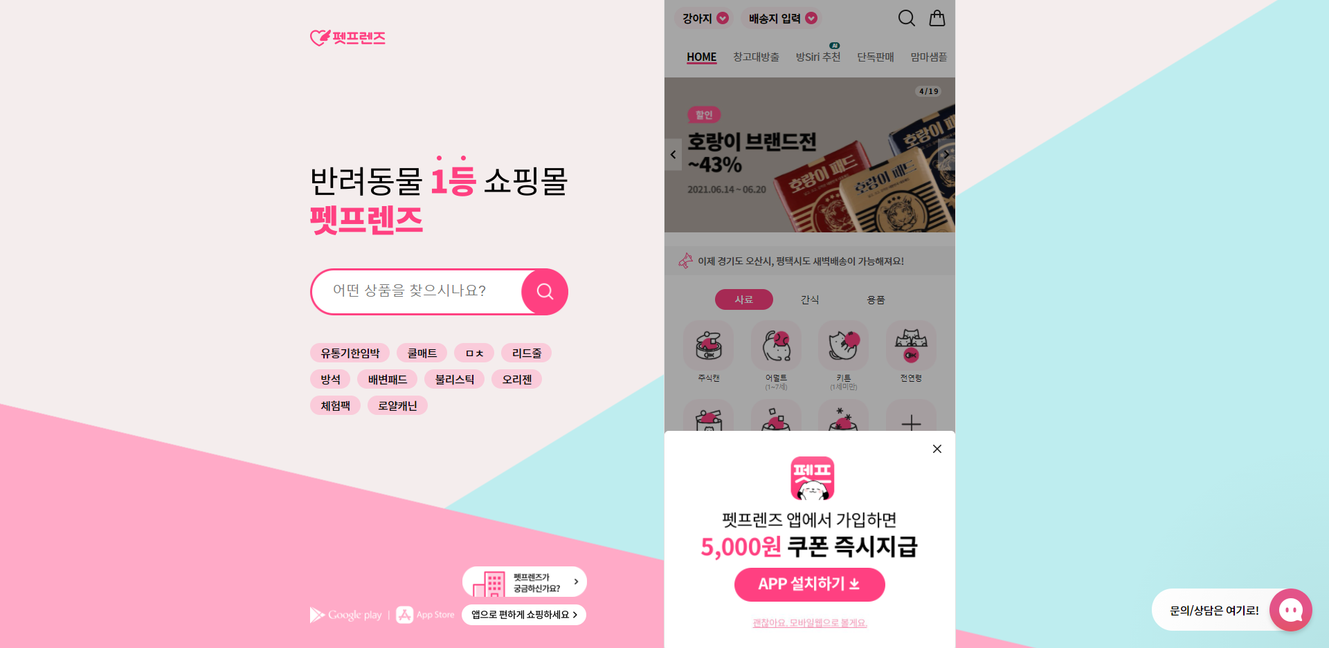 - 단순 인기상품, 베스트 상품이 아닌 "오직 펫프에서만!", "평점 4.5 이상! 심쿵팸들의 선택" 등 서브 타이틀 문구들이 눈에 띈다. 특별히 구매해야겠다는 니즈가 없을 때 평점 좋은 아이템들만 둘러보다가 구매할 수도 있겠다.