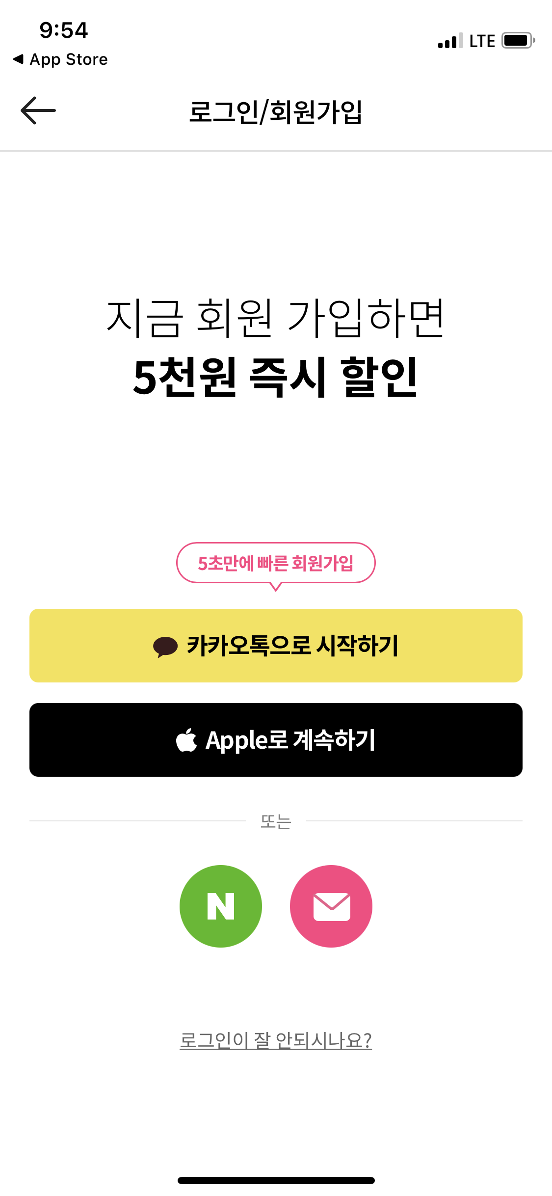 - 로그인 및 회원가입 화면은 소셜 계정으로 가입 버튼을 상단에 노출했고, 이메일로 가입은 하단 제일 마지막 분홍색 메일 아이콘으로 제시하여 탭 하면 가입 페이지로 이동하게끔 설계되었다.