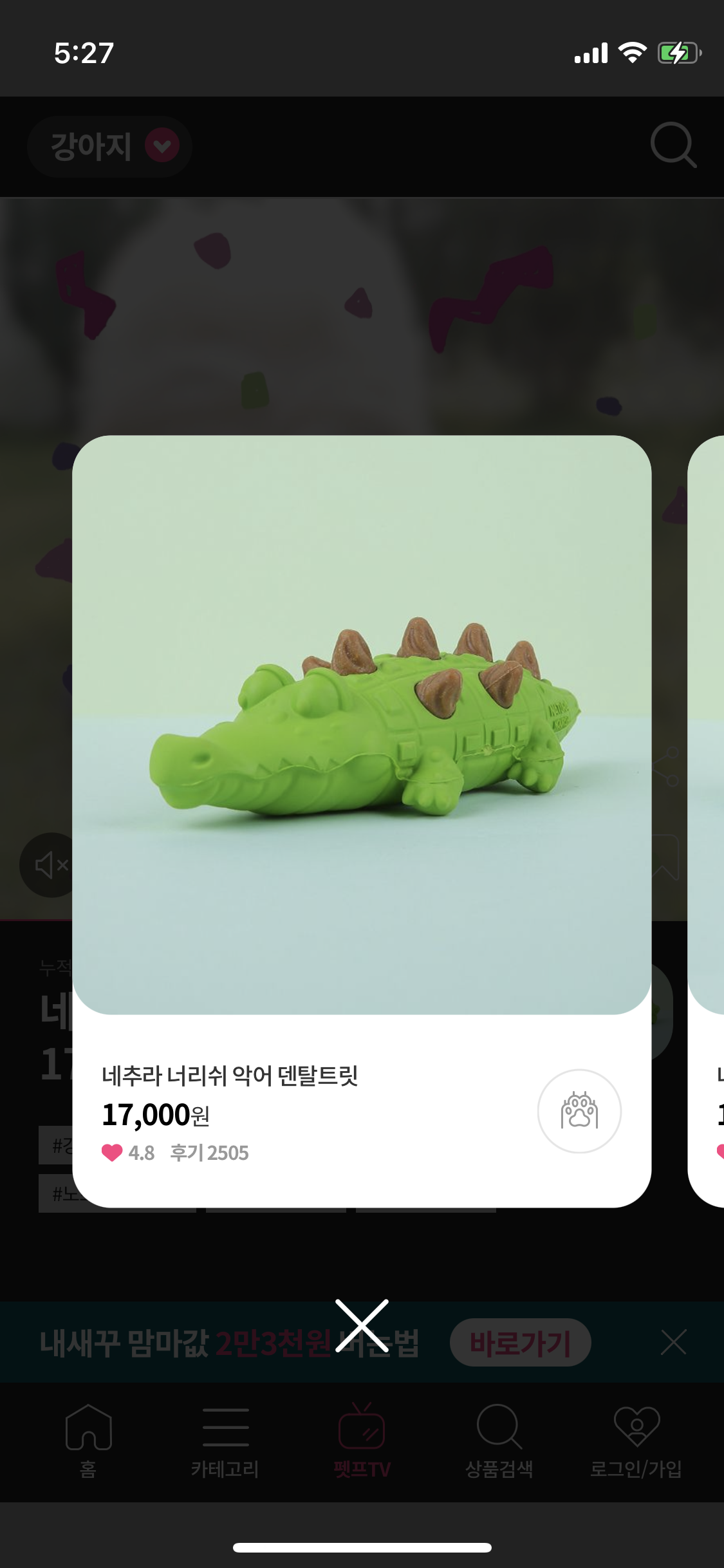 펫프TV 탭에서는 상품 홍보를 영상으로 제공하고 있다.(바로 구매까지 이어지게 설계) - 장난감, 방석 등 강아지들이 실제 사용 과정을 영상으로 보여주며, 해당 영상에 나오는 제품을 우측 하단에 모아두었다.