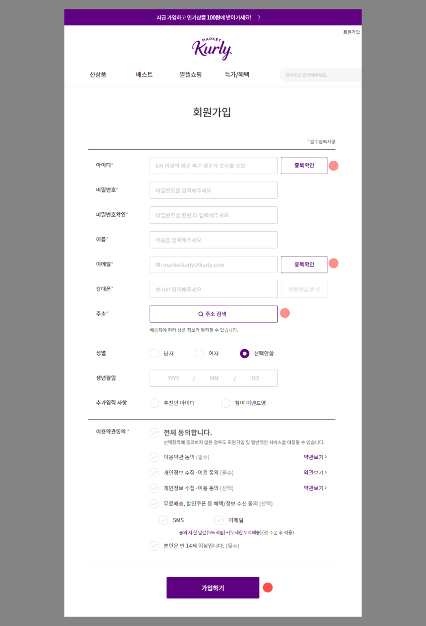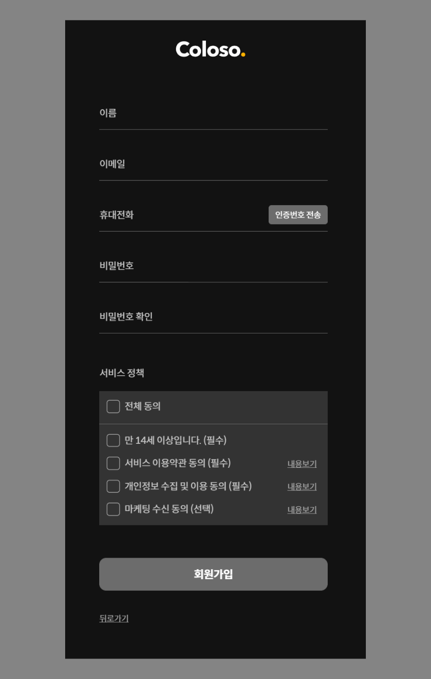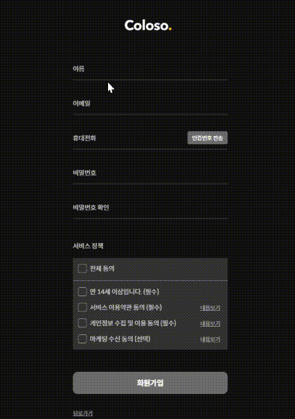 - 최종 목표인 '회원가입' 버튼 제외한 나머지 '중복확인' '인증번호 전송' 버튼의 경우 컬러나 라인 버튼으로 가는 게 더 낫지 않았을까
