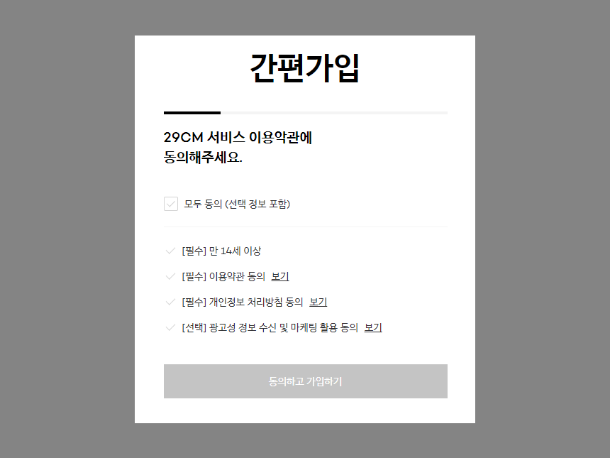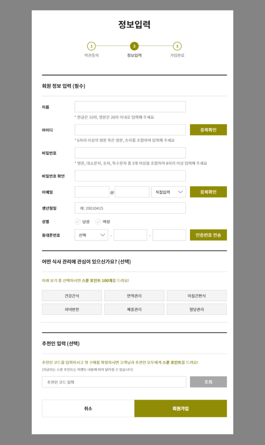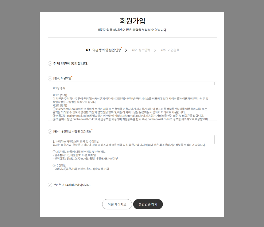 - 약간 및 본인인증을 정보 입력 페이지 함께 녹이는 게 좋을 듯 함. (트렌드에 뒤쳐진 느낌)