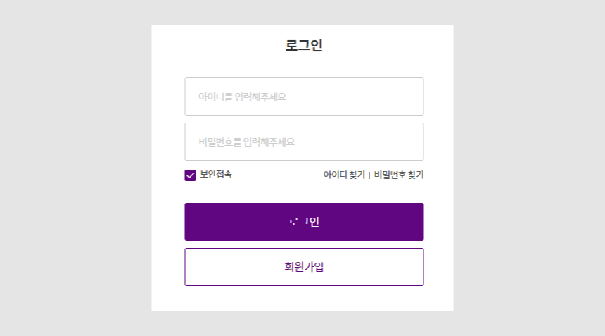 - 로그인 버튼 최 상단 배치. 나머지 '아이디 찾기', '비밀번호 찾기', '회원가입'은 하단 박스안에 묶음 배치