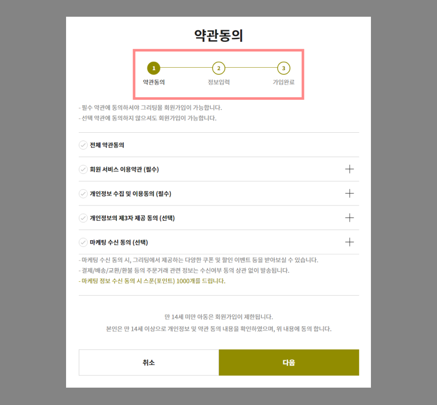 - 그리팅 일반회원 가입의 경우 약관 동의 후 정보 입력 순으로 처리