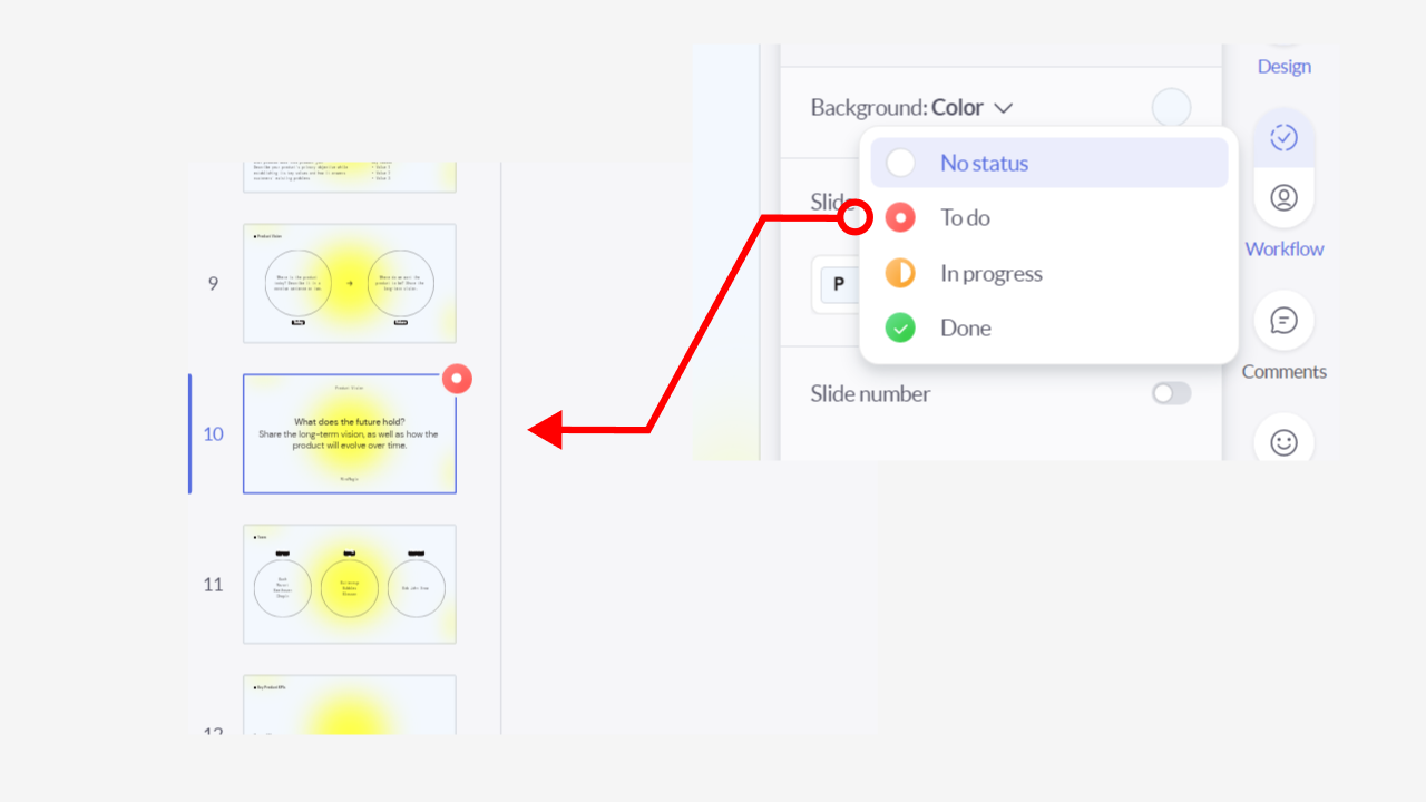 - 슬라이드 상태 표시 변경이 가능하다. 작업 중인지, 작업해야 하는지 완료되었는지 상태를 나타낼 수 있고 협업하기 무척 유용한 기능이다.