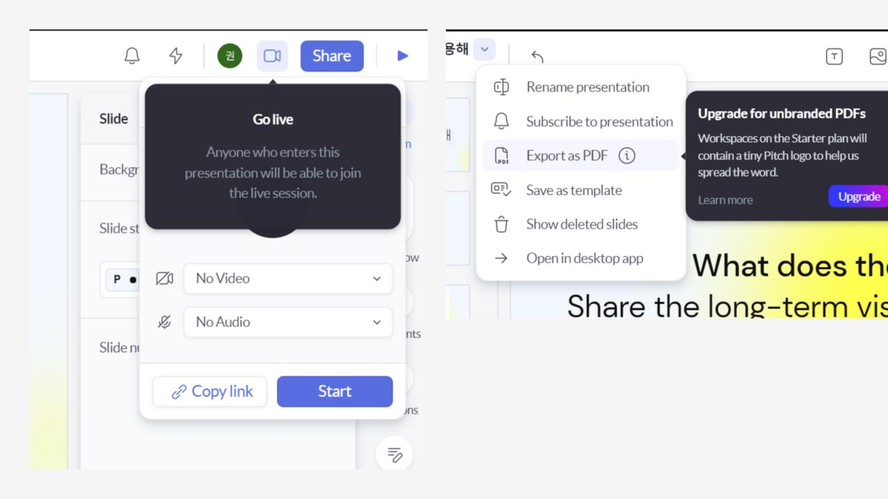 - 특정 프레젠테이션에 멤버를 초대하기 위해서는 프레젠테이션 내의 셰어 기능을 이용한다.