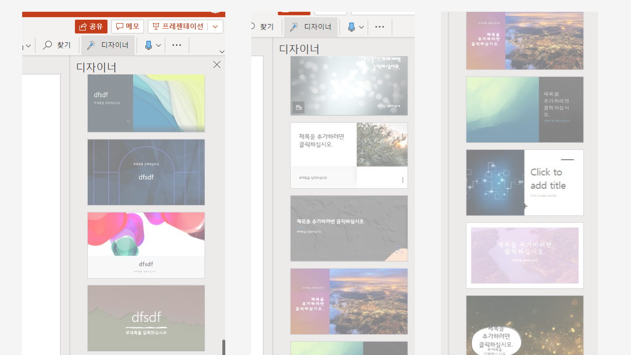 파워포인트에서도 디자이너 템플릿을 제공하지만 pitch와 비교하여 디자인이 정형화되어있고 어딘지 모를 올드함이 묻어난다. (pitch 완승)