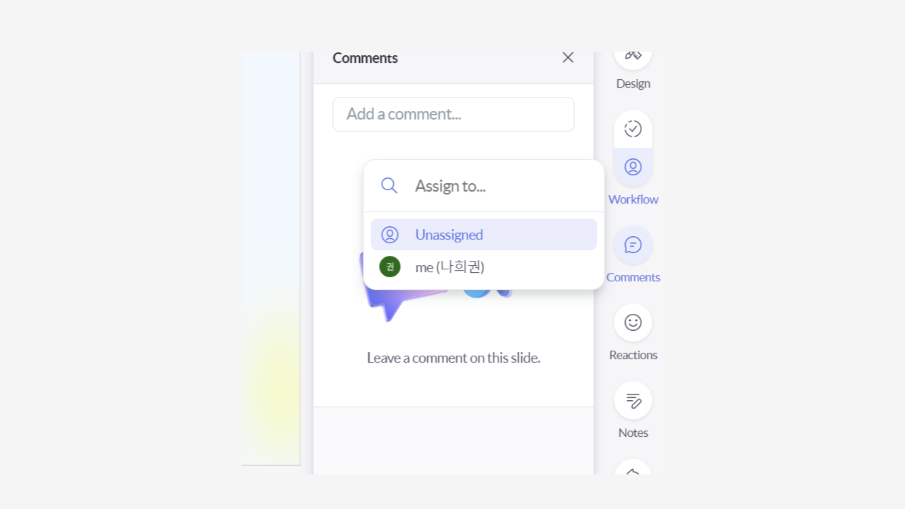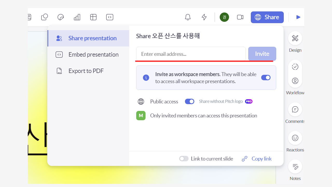 - 현재 프레젠테이션을 공유하고 해당 워크스페이스에도 초대하고 싶다면 하단 토글 버튼을 활성화해주면 된다.